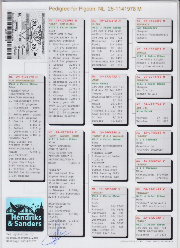 Uit: ”Dai”, vader & gr-vader 1. Prov. 17.172 d., 1. Prov. 8.555 d., 1. Prov. GP 4.344 d., 1.-3.399 d., 1.-3.459 d., 1.-1.711 d., 1.-1.470 d., 1.-1.407 d., 2.-3.193 d., 2.-2.613 d., 2.-1.761 d., 2.-1.640 d. x ”Amy”, dochter ”Odar”, Superkweker