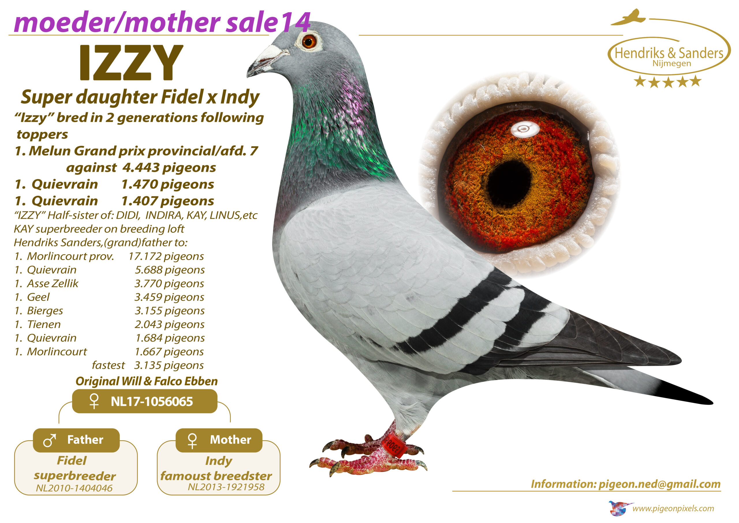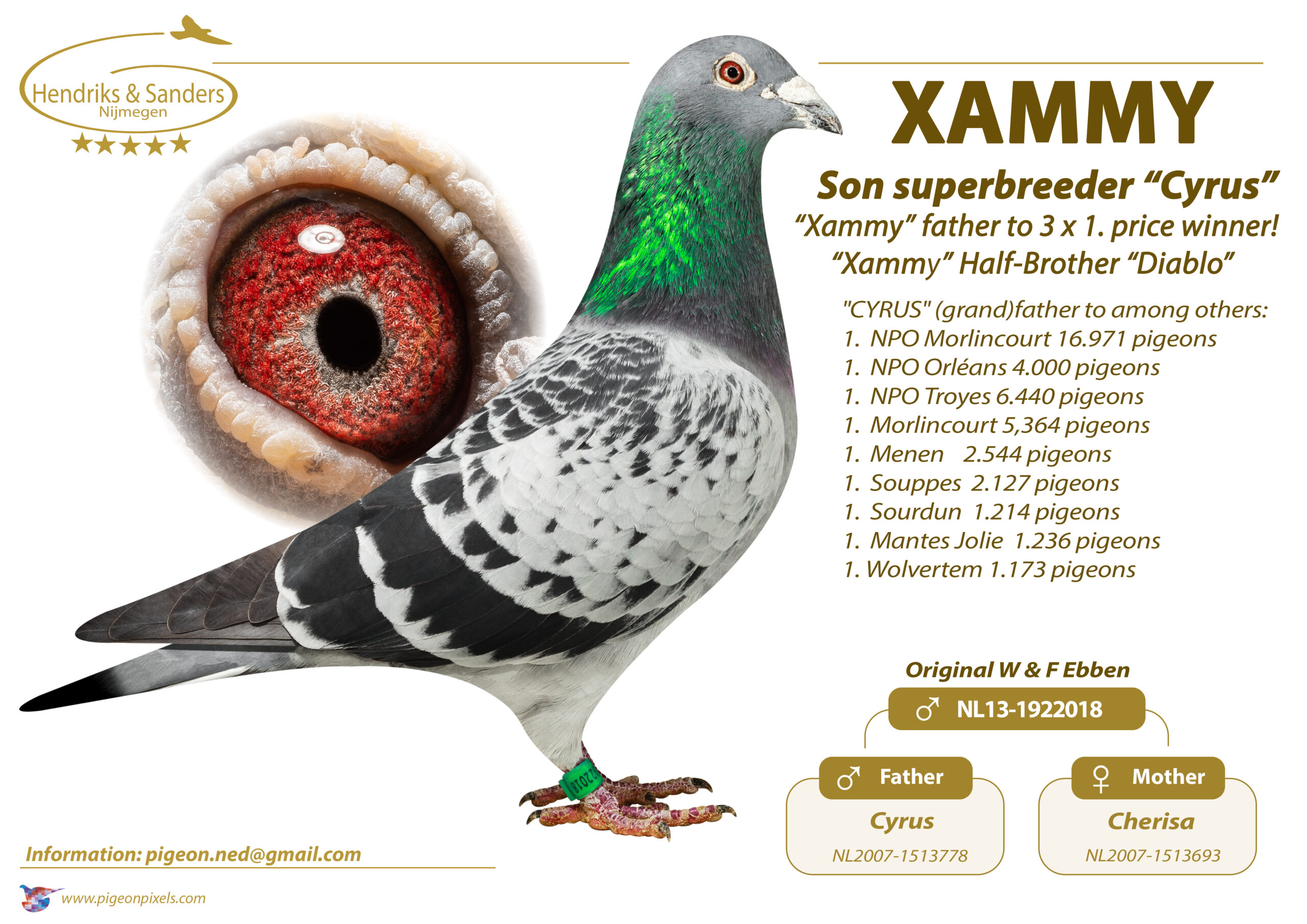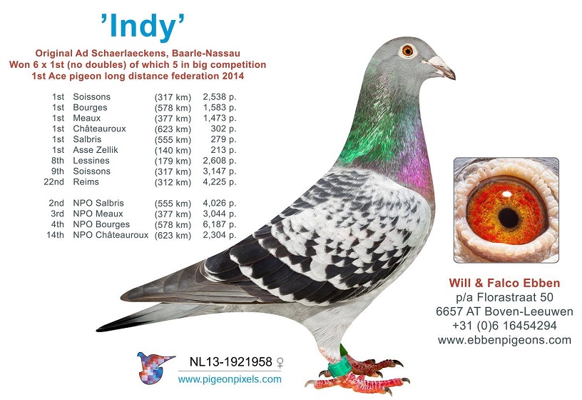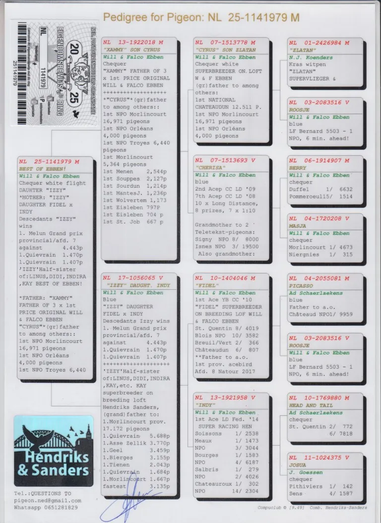 Uit: ”Xammy”, vader 3x 1. Prijs, zoon ”Cyrus”, nazaten: 3x 1. Olympiade, 16x 1. NPO winnaar, 6x 1. Asduif & (Halve) Finale OLR x ”Izzy”, nazaten: 1. Prov. GP 4.443 d., 1.-1.470 d., 1.-1.407 d., dochter ”Fidel” & ”Indy”