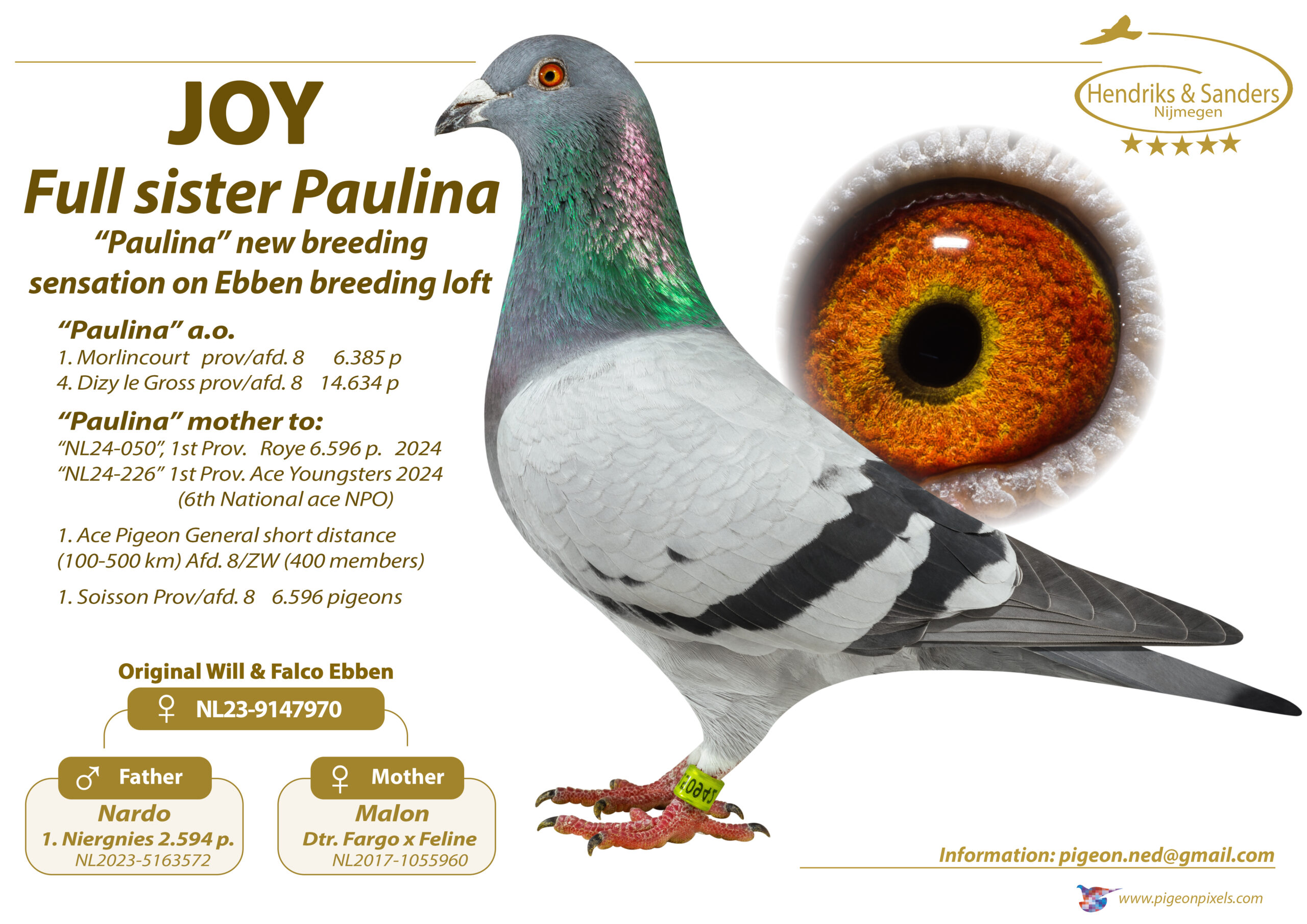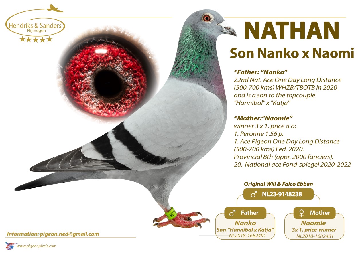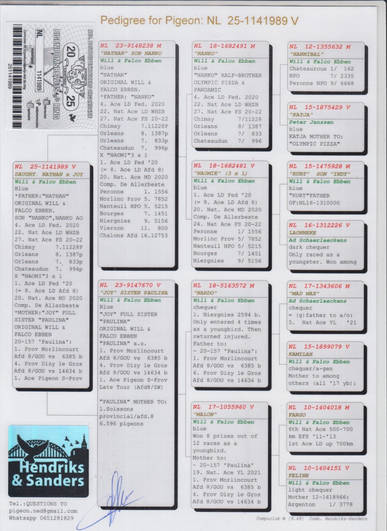 Uit: ”Nathan”, zoon ”Nanko”, 4. Asduif Federatie, 22. Nat. Asduif WHZB, zoon ”Naomie”, 1. Asduif Federatie, 20. Nat. Asduif x ”Joy”, zus ”Paulina”, 1. Prov. Morlincourt 6.385 d., 1. Semi-Prov. Asduif, moeder 1. Prov. 6.596 d.