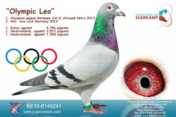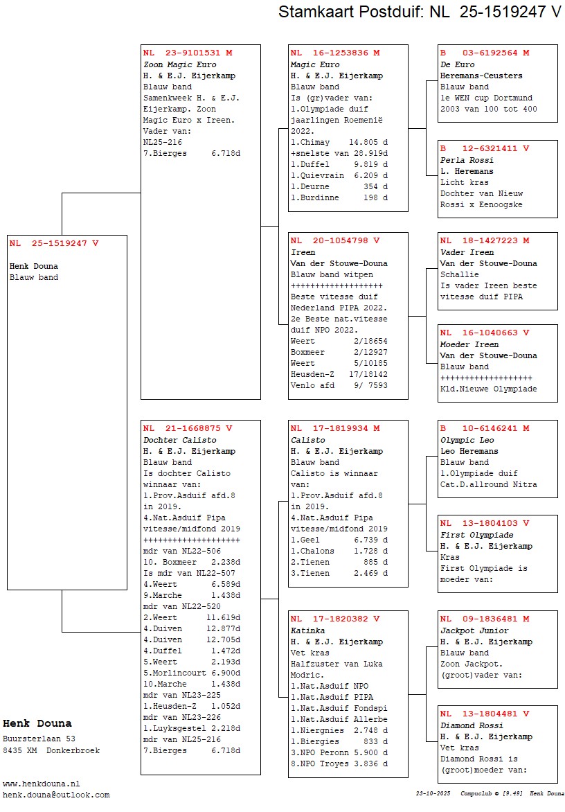 Uit: ”Zoon Magic Euro”, zoon ”Ireen”, 1. Nat. Asduif Sprint PIPA-Rankings, 2. Nat. Asduif NPO, zoon ”New Euro”, Unieke kweker & zoon ”Den Euro” x ”Dochter Calisto”, moeder 1.-2.218 d., 1.-1.052 d., 2.-11.619 d., 4.-12.877 d.
