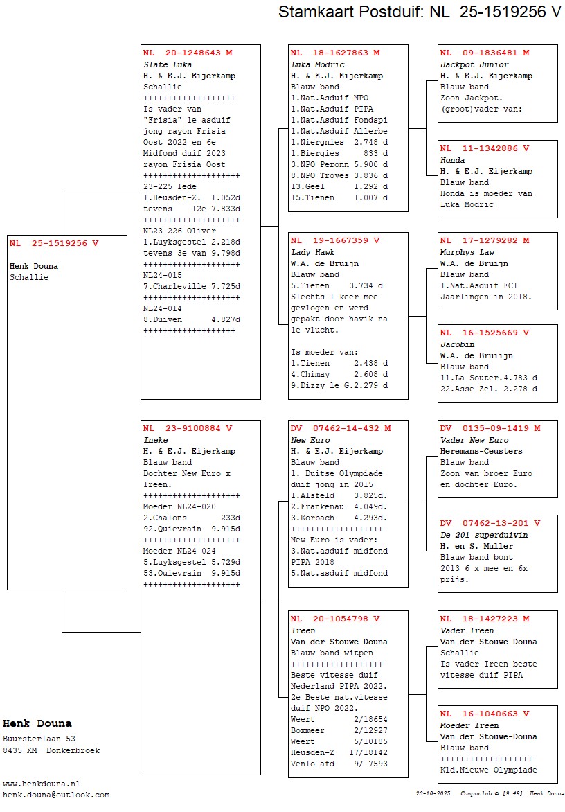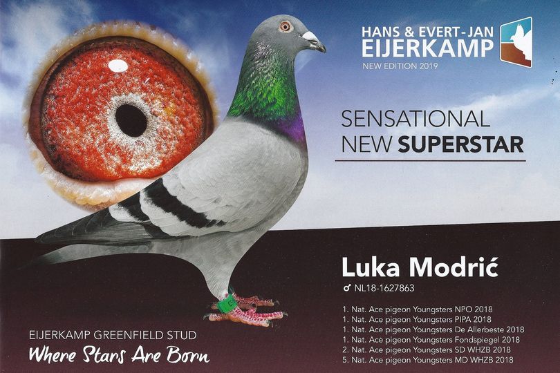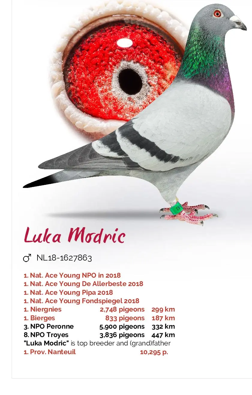 Uit: ”Slate Luka”, vader 1. Asduif Rayon Jonge Duiven, 1.-2.218 d., 1.-1.052 d., zoon ”Luka Modric”, 4x 1. Nat. Asduif Jonge Duiven x ”Ineke”, moeder 5.-5.729 d., dochter ”New Euro” & ”Ireen”, 1. Nat. Asduif Sprint PIPA