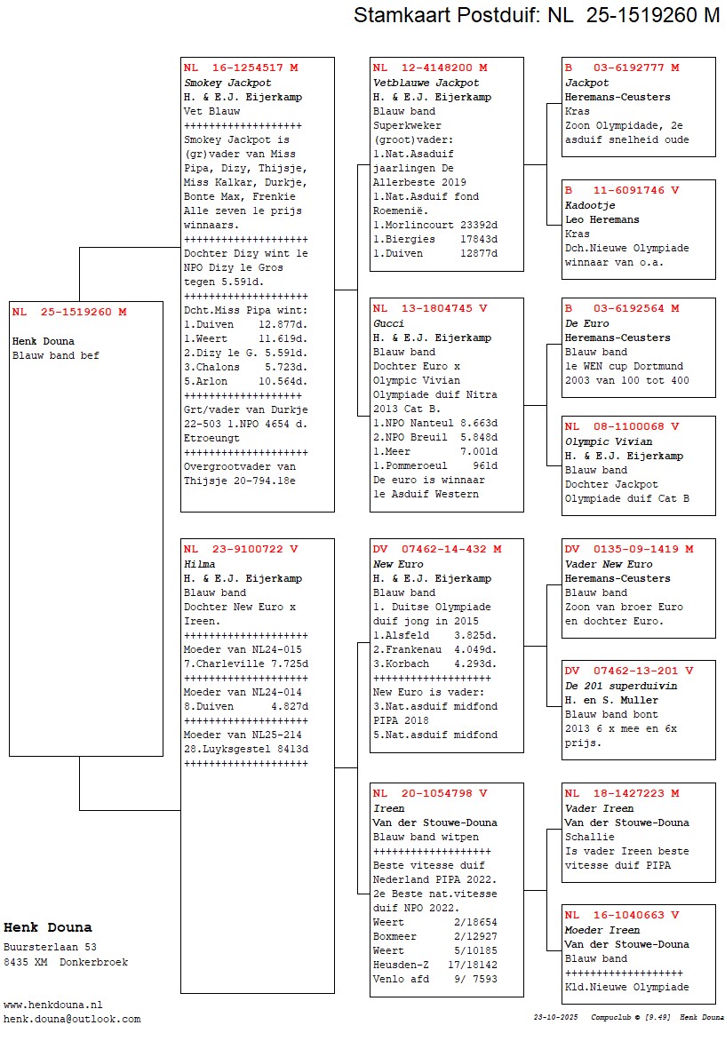 Uit: ”Smokey Jackpot”, Unieke kweker, vader ”Dizy”, 1. NPO 5.591 d., gr-vader 1. NPO 4.654d., zoon ”Vetblauwe Jackpot” x ”Hilma”, moeder 7.-7.725 d., 8.-4.827 d., dochter ”New Euro” & ”Ireen”, 1. Nat. Asduif Sprint PIPA