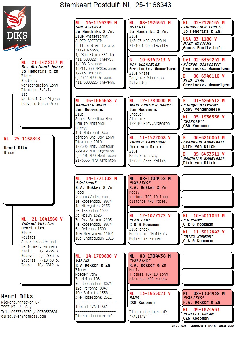 Uit: “BROTHER NATIONAL HARRY”, 1. WBP FCI, 1. Nat. Asduif WHZB / NPO, uit “Son Asterix & Daughter 4000″, J.&F. Hendriks x “INBRED VALITAS”, moeder 1.-9.586d., 2.-7.356d., 7.-10.430d., dochter “Valican & Valira”, R.A. Bakker & Zn.