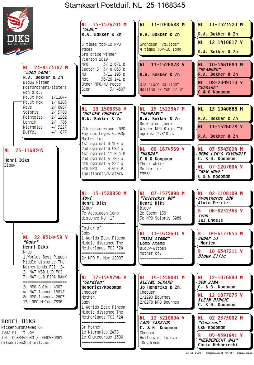 Uit: “SON GENE”, 1/2 broer 1.-11.844d.,1.-6.103d., 2.6.987d., 2.-5.780d, uit “Gene”, 5x top 10 NPO & “Golden Phoenix”, top kweekster x “GABY !!!!”, 1. World Best Pigeons ’24, 2. NPO 4.003d., 4. Nat. 16.817d., 8.NPO 2.603d., dochter “Xavi & Gerdien”.
