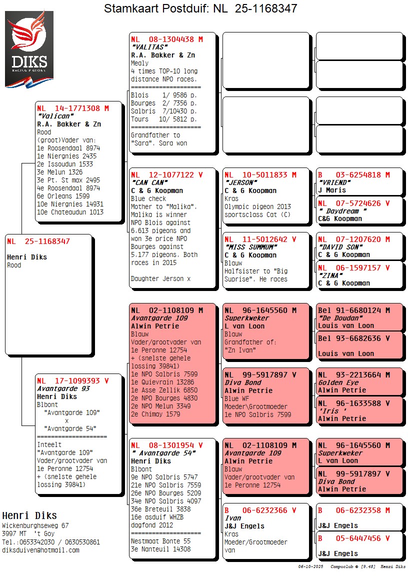 Uit: “VALICAN”, gr.vader: 1.-8.974, 1.-2.435, 2.-1.533, 3.-2.495, 4.-8.974, 6.-1.599, etc. uit “Valitas & Can Can”, R.A. Bakker & Zn, 4x top 10 NPO x “AVANTGARDE 93”, uit “Avantgarde 109”, (gr.)vader 1.-39.841, 1.-13.286 & “Avantgarde 54”, 9.+21.+26.+34. NPO.