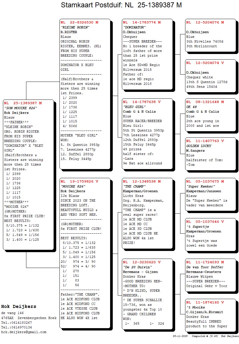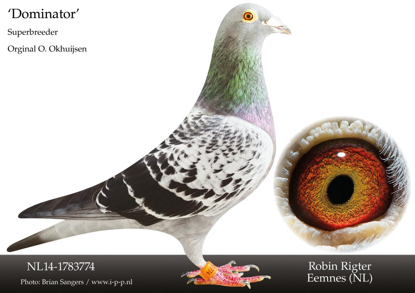 Uit: ”Kleine Robin”, zoon stamvader ”Dominator”, Nr. 1 kweker Robin Rigter x ”Mooike 826”, moeder & gr-moeder 8x 1. Prijs, 1.-1.723 d., 3.-1.400 d., 5.-1.849 d., 8.-10.375 d., dochter ”The Champ”, 4x 1. Asduif