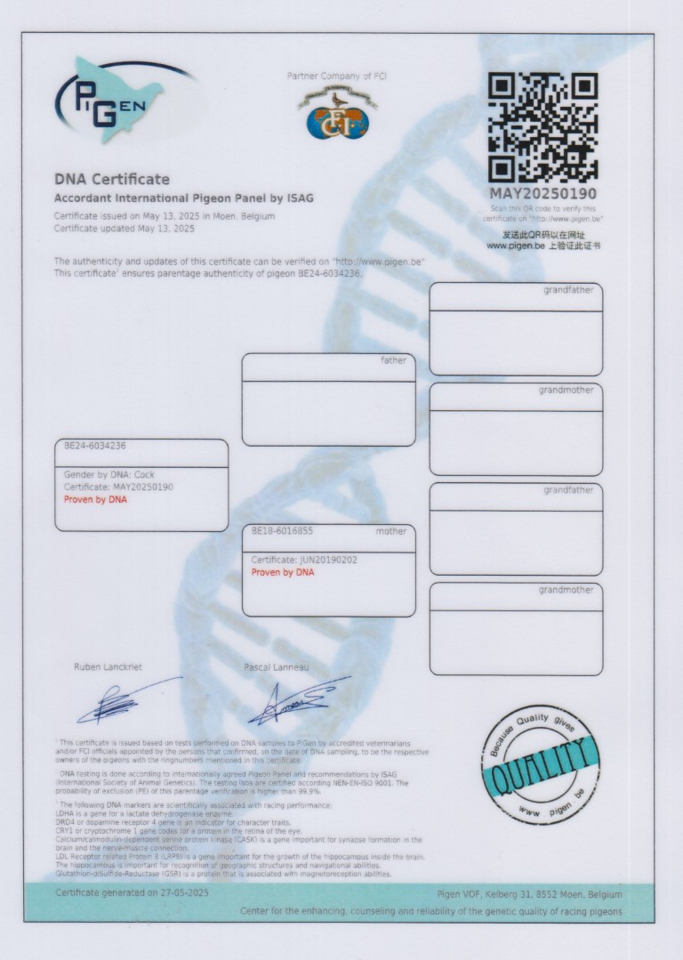 Grootmoeder: BE21-3046494. ‘Miss Armando’, Verstraete Pigeons