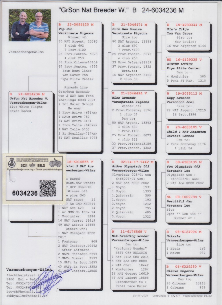 Uit: ”Top Gun”, 7. Prov. Argenton 4.100 d., 25. Prov. 5.073 d., 33. Prov. 13.159 d., 37. Prov. 4.352 d., lijn ”Armando”, ”Finn” & ”Louise” x ”Nestsist. 5. Nat. Ace”, nestzus ”Nat. Wonder”, 1. Nat. Asduif & 5. Nat. Asduif KBDB