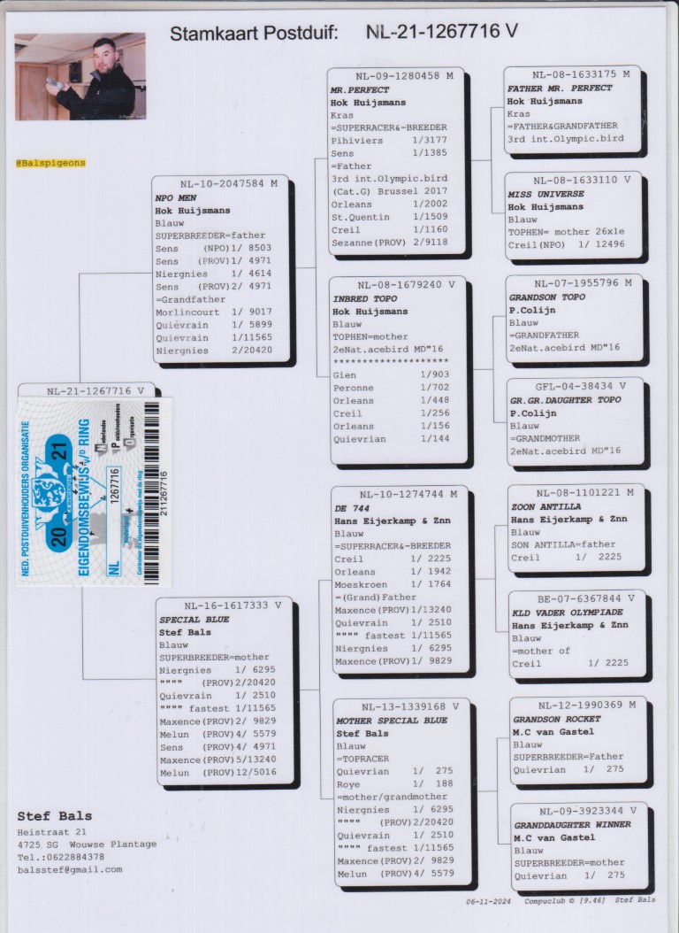 Uit: “NPO MEN”, vader 1.-8.503d., 1.-4.971d., 1.-4.614d., 2.-4.971d., gr.vader 1.-9.017d., 1.-11.565d., 2.-20.420d., stamvader Stef Bals, zoon “Mr. Perfect & Inbred Topo” x “Special Blue”, 1.-6.295d., 2.-20.420d., 1.-11.565d., 2.-9.829d., 4.-5.579d. !!!!!!!!!!