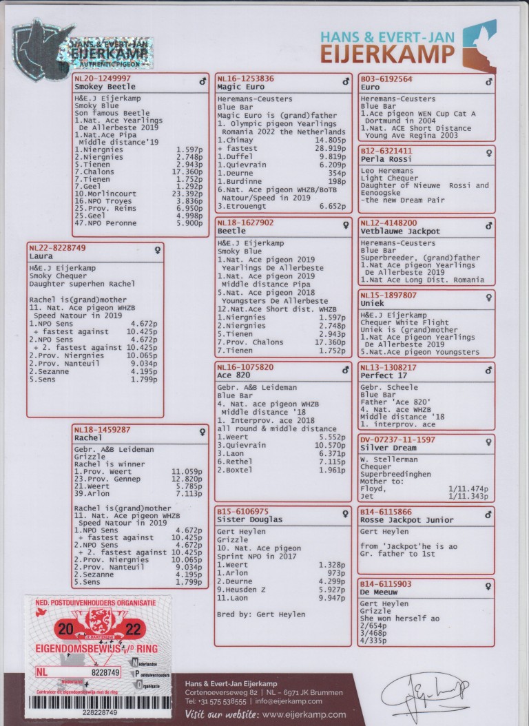Uit: “SMOKEY BEETLE”, zoon “Beetle”, 1. Nat. Asduif JL 2019, 1. Nat. Asduif MF PIPA x “RACHEL”, Gebr. Leideman 1. Prov.-11.059, 23. Prov.-12.820, grm. 11. Nat. Asduif Natour, uit “Ace 820 & Sister Douglas”.