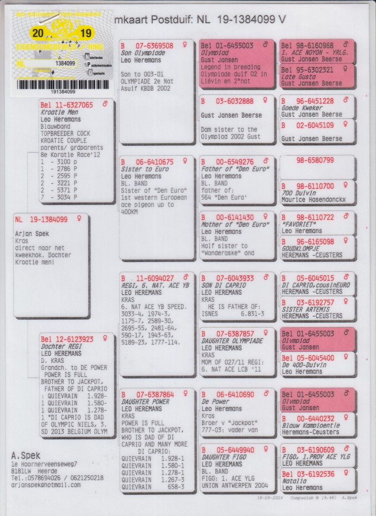 Uit: ”Kroatie Men”, (Gr) vader 1.-3.100 d., 1.-2.786 d., 2.-5.371 d., 2.-3.221 d., 2.-2.595 d., uit zoon ”Olympiade 003”, Olympiade duif Cat. Sprint x ”Dochter Regi”, inteelt ”Olympiade 003”, Olympiade duif, uit klz. ”Di Caprio”