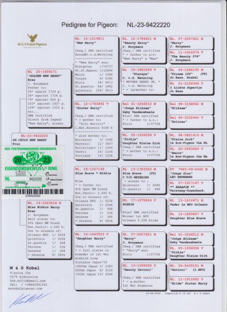 Uit: ”Golden New Harry”, vader 25.-1.724 d., 36.-1.724 d., zoon ”New Harry”, 1. Prov. 14.737 d., 1. Prov. 12.894 d., uit zus ”Harry”, 1. Nat. Asduif Dagfond WHZB x ”Miss Nikkie Harry”, uit broer kweker ”Corrie”, 1. Nat. Asduif