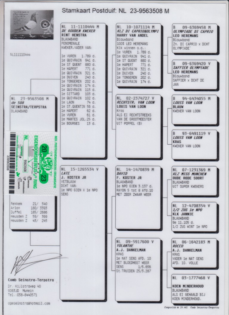 ”De 508”, 21. Rekkem 540 d., 43. Heusden Zolder 245 d., 59. Heusden Zolder 369 d., 180. Arlon 3.393 d., 185. Duffel 2.686 d., uit: ”De Gouden Kweker”, vader 17x 1. Prijs x ”Late”, dochter ”David”, 1. NPO Gien 3.137 d.