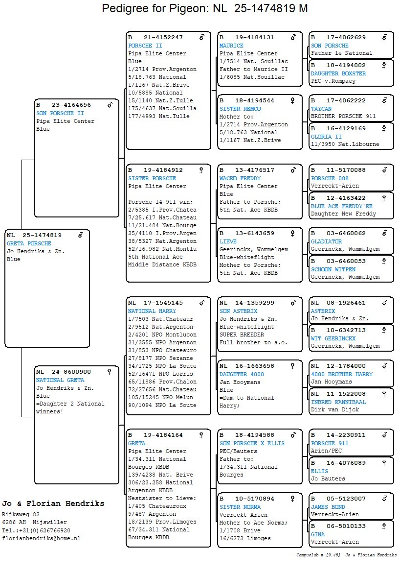 Uit: “Son Porsche II”, 5. Nat. Argenton 18.763d.,10. Nat. Brive 5.885d. & “Sister Porsche 911”, 5. Nat. Asduif KBDB, uit “Wacko Freddy & Lieve” x “National Greta”, dochter “National Harry”, 1. World Best Pigeons, 1.+2. Nationaal & “Greta”, 1. Nat. Bourges.
