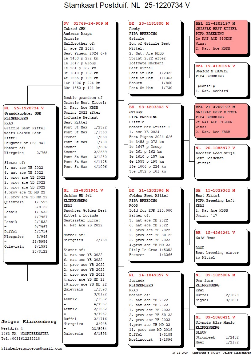 Uit: ”Inbred GBK”, 1/2 broer 1. Asduif Jonge Duiven, 1.-3.453 d., 1.-1.647 d., uit zoon & dochter ”Grizzle Best Kittel” x ”Golden BK 941”, dochter ”Golden Best Kittel”, vader 1.-2.-2.-4. Prov. Asduif, 3. & 6. Nat. Asduif Jonge Duiven