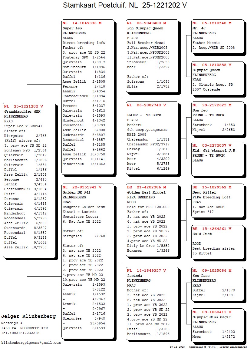 Uit: ”Super Leo”, vader 1.-3.817 d., 1. NPO 2.564 d., 1.-1.896 d., 2.-1.505 d., 3.-4.354 d., 3. NPO 1.894 d., 3.-1.716 d. x ”Golden BK 941”, dochter ”Golden Best Kittel”, vader 1.-2.-2.-4. Prov. Asduif, 3. & 6. Nat. Asduif Jonge Duiven