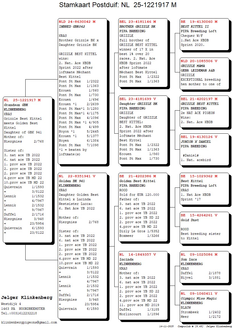 Uit: ”Inbred GBK”, uit broer & dochter ”Grizzle Best Kittel”, 2. Nat. Asduif Sprint KBDB, uit zoon 1. Nat. Asduif KBDB x ”Golden BK 941”, dochter ”Golden Best Kittel”, vader 1.-2.-2.-4. Prov. Asduif, 3. & 6. Nat. Asduif Jonge