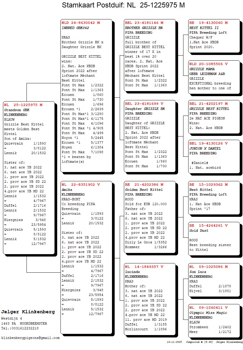 Uit: ”Inbred GBK”, uit broer & dochter ”Grizzle Best Kittel”, 2. Nat. Asduif Sprint KBDB, uit zoon 1. Nat. Asduif KBDB x ”Anika”, 1.-1.593 d., zus 1.-2.-2.-4. Prov. Asduif, dochter ”Golden Best Kittel”, Unieke Superkweker