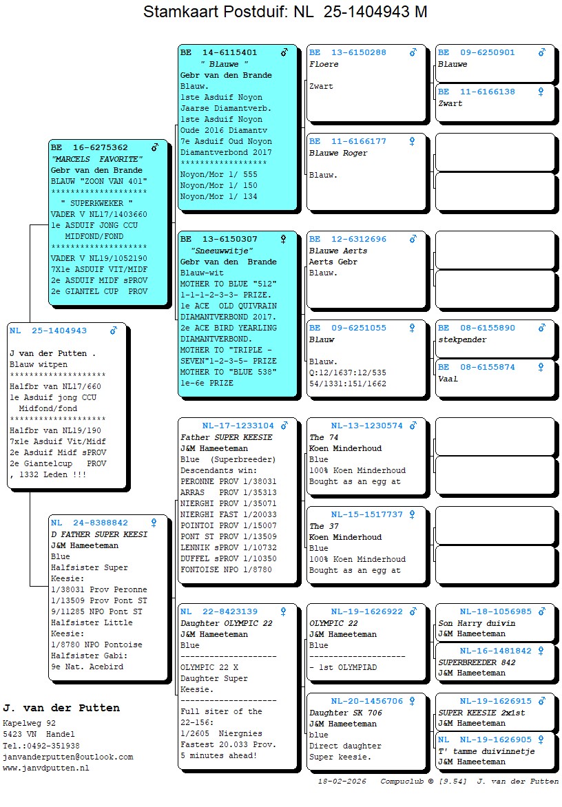 Uit: ”Marcels Favorite”, Gebr. v/d Brande, vader 1. Asduif Jonge, 2. Semi-Prov. Asduif x ”D. Father Super Keesie”, Hameeteman, 1/2 zus 1. Prov. Peronne 38.031 d., 1. Prov. Pt.St.Maxence 13.509 d., 1. NPO Pontoise 8.780 d.