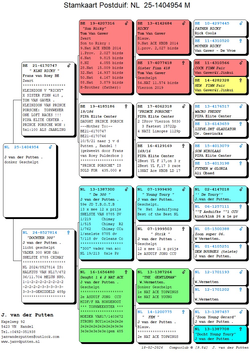 Uit: ”Klz. Ricky”, uit zoon ”Ricky”, 9. Nat. Asduif KBDB & ”Sister Finn 418”, (Gr) ouders 1. Extra Finale OLR PIPR Pattaya, uit dochter ”Prince Porsche” x ”Dochter 300”, dochter ”De 300”, 1. Prov. Chimay 8.785 d.