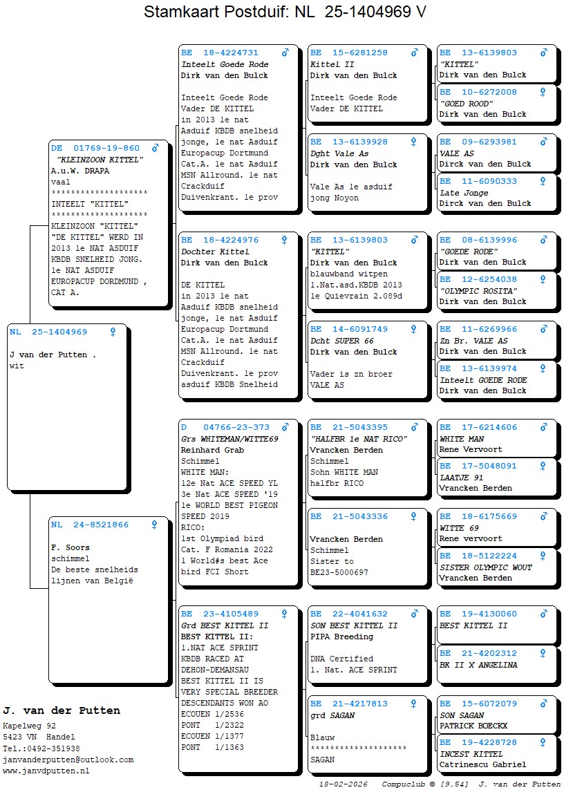 Uit: ”Kleinzoon Kittel”, uit dochter ”Kittel”, 1. Nat. Asduif Sprint KBDB & legendarische kweker x ”De 866”, uit kld. ”Best Kittel II”, 1. Nat. Asduif KBDB, lijn ”Olympic Rico”, 1. Int. Asduif, 1. Olympiade duif, 1. Nat. Asduif KBDB