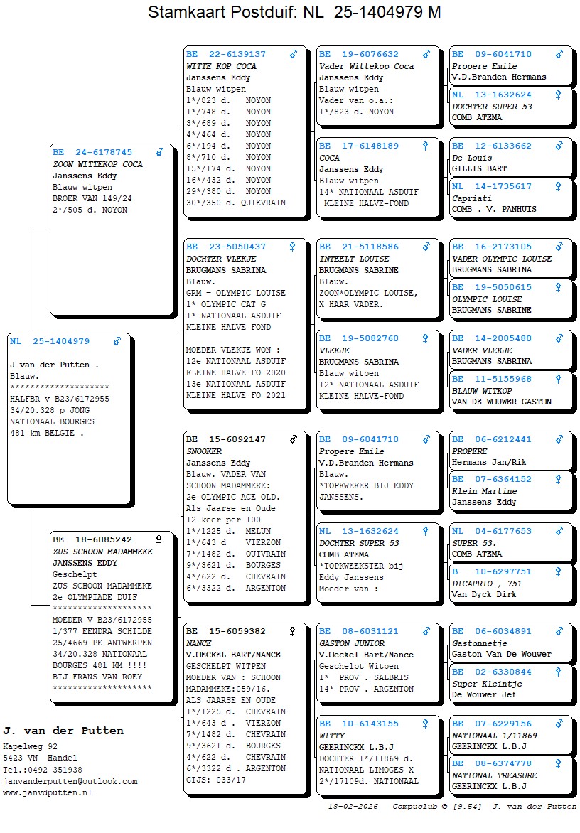 Hij komt uit: BE19-6076632. Vader ‘Wittekop Coca’, Janssens Eddy
