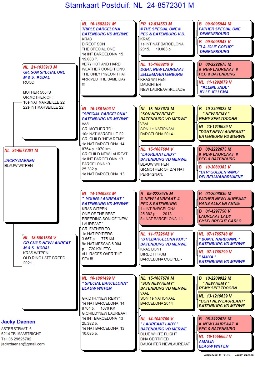 Uit: ”Grs. Special One”, uit zoon ”Special One”, 1. Int. Barcelona, uit kld. ”New Laureaat”, 1. Int. Barcelona x ”Gr.child New Laureaat”, uit zoon ”New Laureaat”, 1. Int. Barcelona, uit kld. ”New Laureaat”, 1. Int. Barcelona
