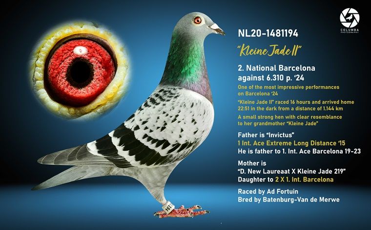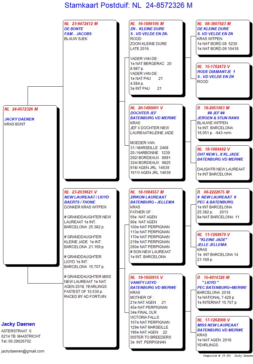 Uit: ”De Bonte”, uit dochter ”Jef”, 1. Int. Barcelona 16.051 d. (90 min. vooruit) x ”New Laureaat / Lloyd”, uit zoon ”New Laureaat”, 1. Int. Barcelona 25.382 d., uit dochter ”Lloyd”, 1. Int. Barcelona 15.707 d. & ”Miss New Laureaat”