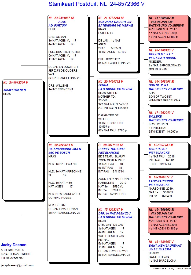 Uit: ”Adje”, uit zoon ”De Jan”, 1. Nat. Agen, 4. Int. Agen, uit kld. ”New Laureaat” & ”Kleine Jade”, uit klz. ”Jef” x ”Pau-Narbonne-Agen”, uit dochter ”De Jan”, 1. Nat. Agen, uit kld. ”New Laureaat”, uit zoon ”Mister Pau”, 1. Nat.