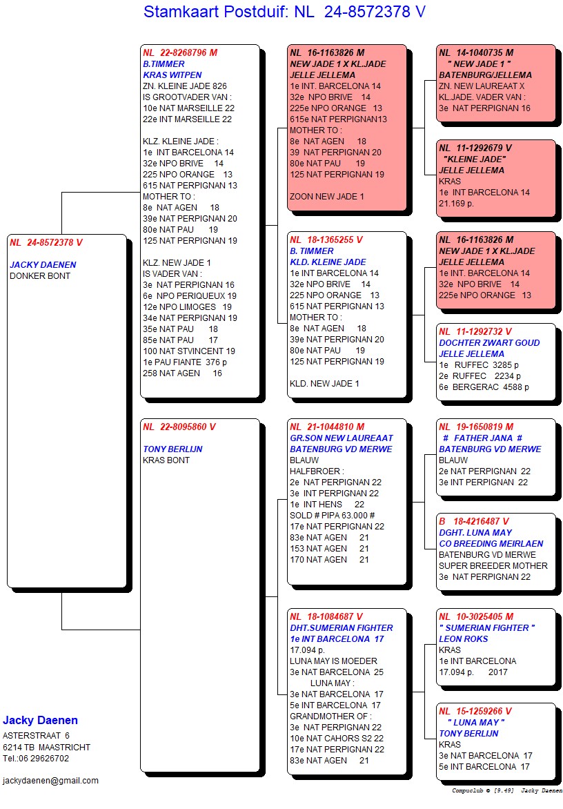 Uit: ”B. Timmer”, gr-vader 10. Nat. Marseille, 22. Int. Marseille, uit zoon ”Kleine Jade”, 1. Int. Barcelona x ”De 860”, uit 1/2 broer ”Jana”, 2. Nat. Perpignan, 3. Int. Perpignan, uit dochter ”Sumerian Fighter”