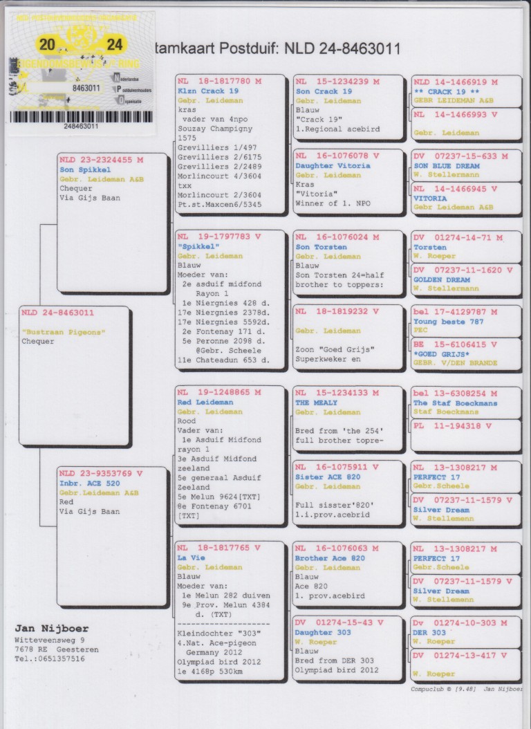 Uit: ”Son Spikkel”, 1/2 broer 2.-6.175 d., 2.-3.604 d., 4.-3.604 d., 4. NPO 1.575 d., uit kld. ”Goed Grijs”, uit klz. ”Crack 19” x ”Inbred Ace 820”, 1/2 zus 3. Prov. Asduif Midfond, 5. Prov. Asduif Allround, inteelt ouders ”Ace 820”