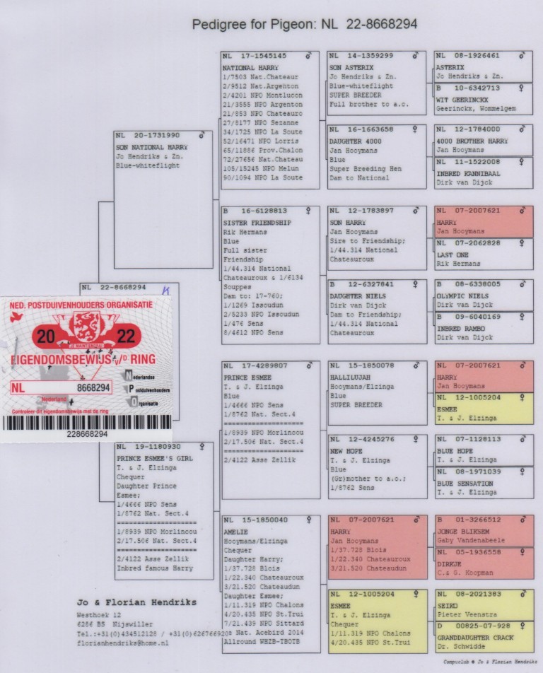 Uit: ”Son National Harry”, zoon ”National Harry”, 1. Int. Asduif Dagfond FCI, 1. Nat. Chateauroux 7.503 d. x ”Prince Esmee’s Girl”, dochter ”Prince Esmee”, 1. Nat. Sens, 1. NPO Morlincourt, uit dtr. ”Harry” & ”Esmee”