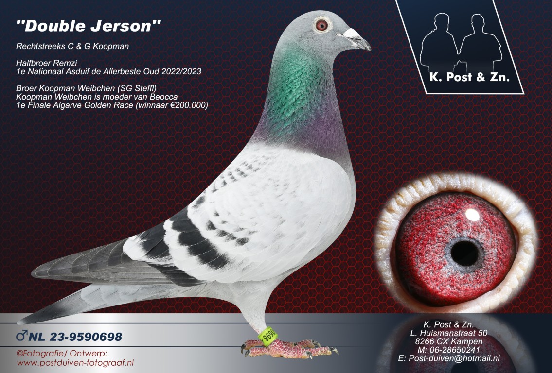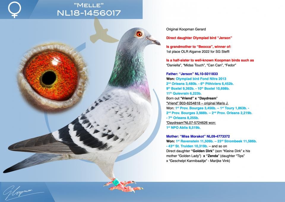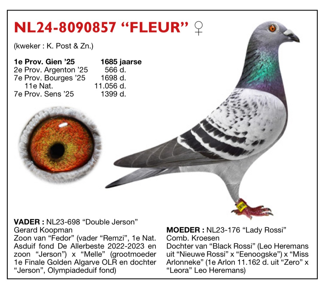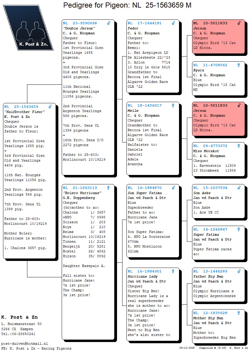 Uit: ”Double Jerson”, C. & G. Koopman, vader 1. Prov. 1.685 d., 2. Prov. 566 d., 3. Prov. 4.406 d., 7. Prov. 1.399 d., 11. Nat. Bourges 11.056 d. x ”Bolero Hurricane”, moeder & gr-moeder 1.-3.657 d., 1.-210 d., 1.-203 d., 3.-408 d.