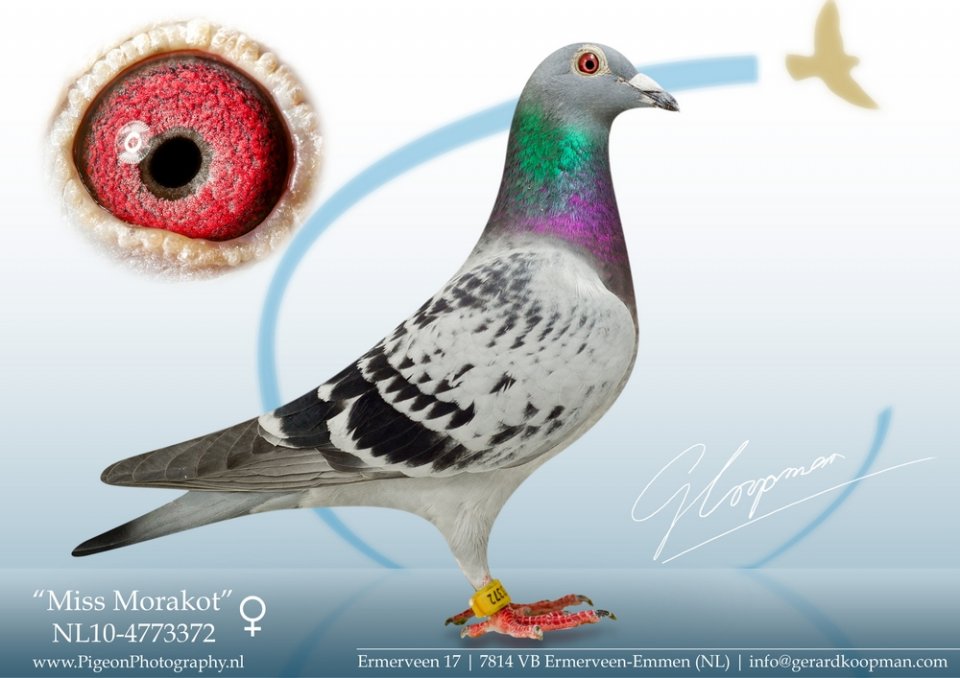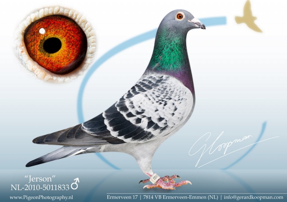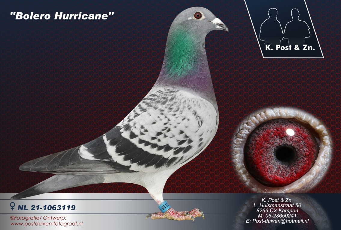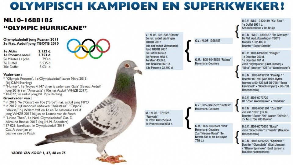 Uit: ”Double Jerson”, C. & G. Koopman, vader 1. Prov. 1.685 d., 2. Prov. 566 d., 3. Prov. 4.406 d., 7. Prov. 1.399 d., 11. Nat. Bourges 11.056 d. x ”Bolero Hurricane”, moeder & gr-moeder 1.-3.657 d., 1.-210 d., 1.-203 d., 3.-408 d.