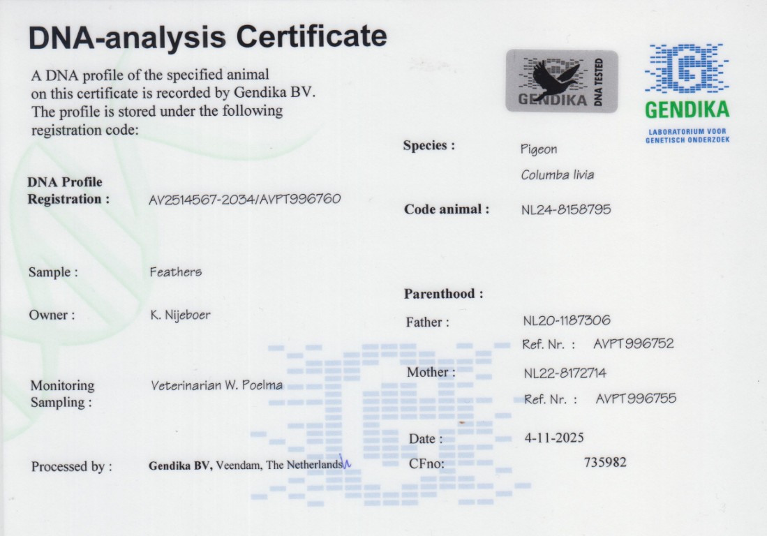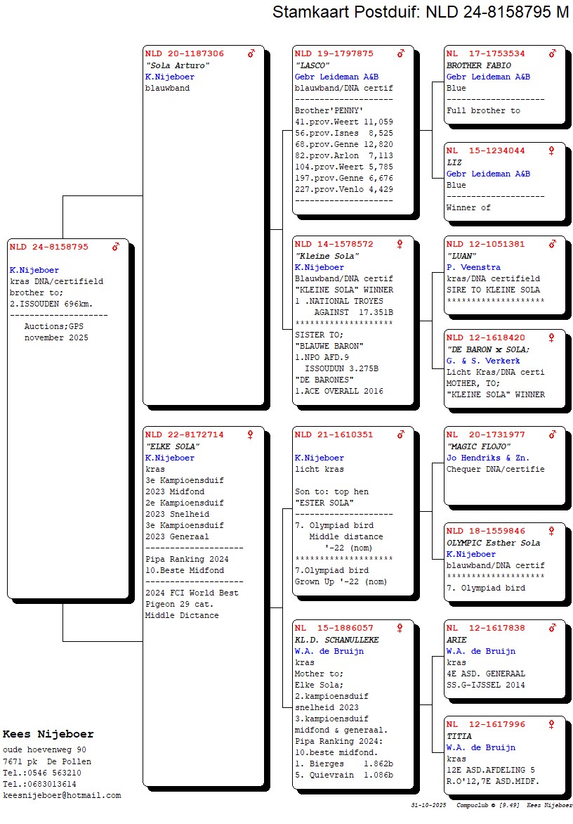 Uit: ”Sola Arturo”, zoon ”Kleine Sola”, 1. Nat. Troyes 17.351 d., uit klz. ”Arturo” & ”Tila” x ”Elke Sola”, 10. Nat. Asduif Midfond PIPA-Rankings, 2.-3.-3. Asduif, 6.-1.151 d., 23. NPO 23.938 d., 27. NPO 15.063 d., 27. NPO 14.497 d.