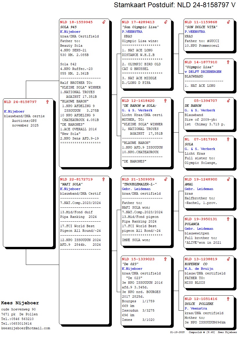 Uit: ”Sola 945”, vader 4. NPO Ruffec 2.361 d., 4. NPO Sens 2.085 d., 1/2 broer ”Kleine Sola”, 1. Nat. Troyes 17.351 d. x ”Nafi Sola”, 7. Nat. Asduif Oude Duiven, 13. Nat. Asduif Midfond & Dagfond, 2.-1.943 d., 12. NPO 2.851 d., 13.-11.957