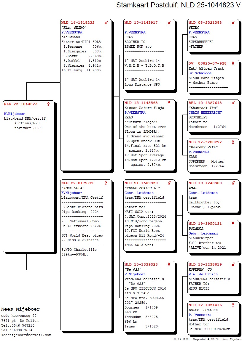 Uit: ”Klz. Seiko”, vader ”Didi Sola”, 1.-808 d., 1.-706 d., 3.-2.068 d., 3.-1.510 d. x ”Imke Sola”, 5. Nat. Asduif Midfond PIPA-Rankings, 1. Prov. Noord 6.156 d., 1.-1.161 d., 23. Nat. Asduif ”Allerbeste”, 27. Nat. Asduif Midfond FCI