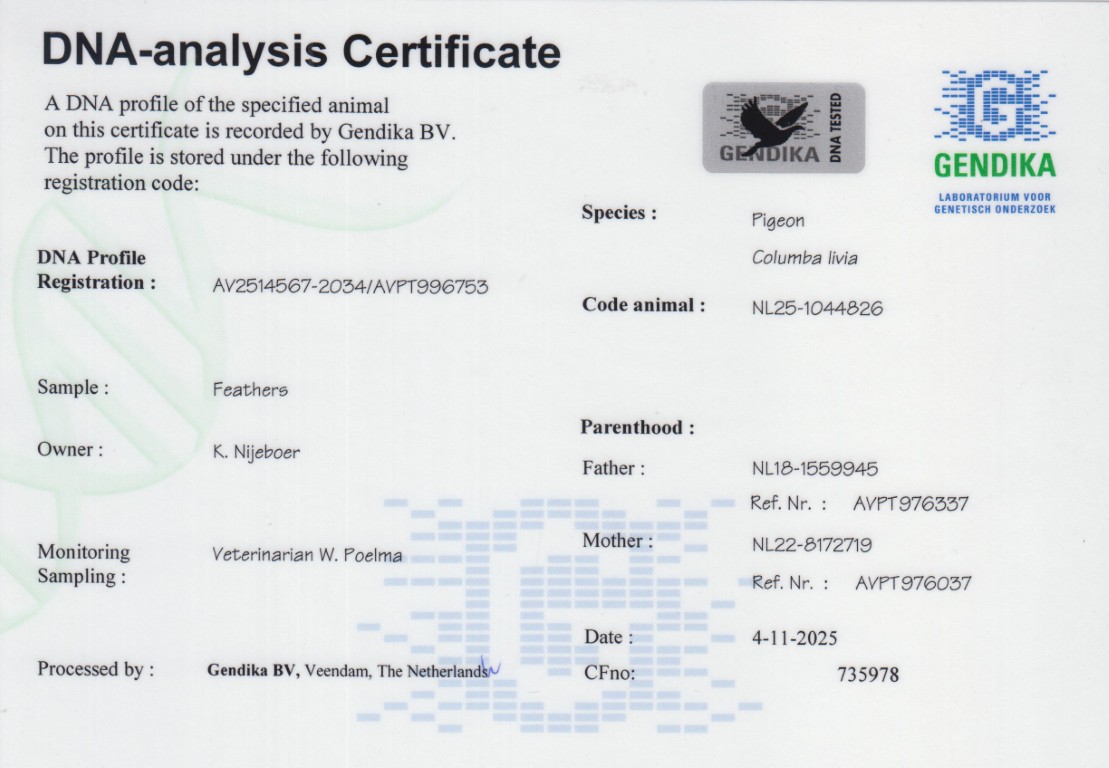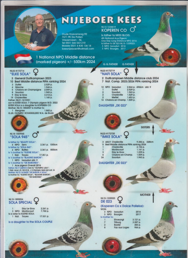 Uit: ”Sola 945”, vader 4. NPO Ruffec 2.361 d., 4. NPO Sens 2.085 d., 1/2 broer ”Kleine Sola”, 1. Nat. Troyes 17.351 d. x ”Nafi Sola”, 7. Nat. Asduif Oude Duiven, 13. Nat. Asduif Midfond & Dagfond, 2.-1.943 d., 12. NPO 2.851 d., 13.-11.957