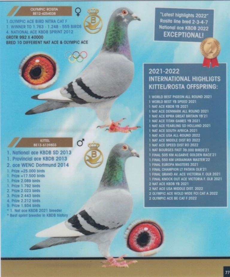 Uit: ”Direct Child Kittel”, uit zoon ”Kittel”, 1. Nat. Asduif Sprint KBDB & zoon ”Olympic Rosita”, uit dochter ”Kittel”, 1. Nat. Asduif Sprint KBDB x ”van den Bulck Dirk”, dochter ”Blauwe Beer 260”, zoon ”Broer Goede Rode”