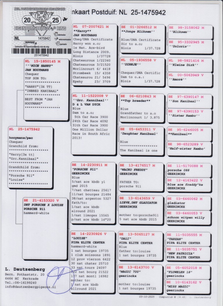 Uit: “Nice Harry”, top kweker, zoon “Harry”, 1.-37.728d., 1.-22.340d., uit “Jonge Bliksem & Dirkje” & “Inbred Kannibaal” x “The 320”, dochter “Porsche 911”, 5. Nat. Asduif KBDB & “Louise”, 1. Nat. Bourges 19.735d.