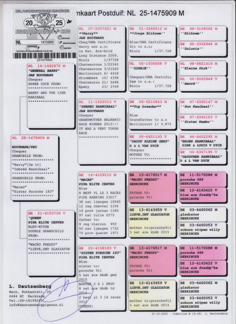 Uit: ”General Harry”, zoon ”Harry”, 1. Nat. Asduif Dagfond WHZB, 1.-37.728 d., 1.-22.340 d., 3.-21.520 d. x ”Queen”, dochter ”Macan”, 8. Nat. Asduif Fond, uit broer & dochter ”Porsche 911”, 5. Nat. Asduif GHF KBDB