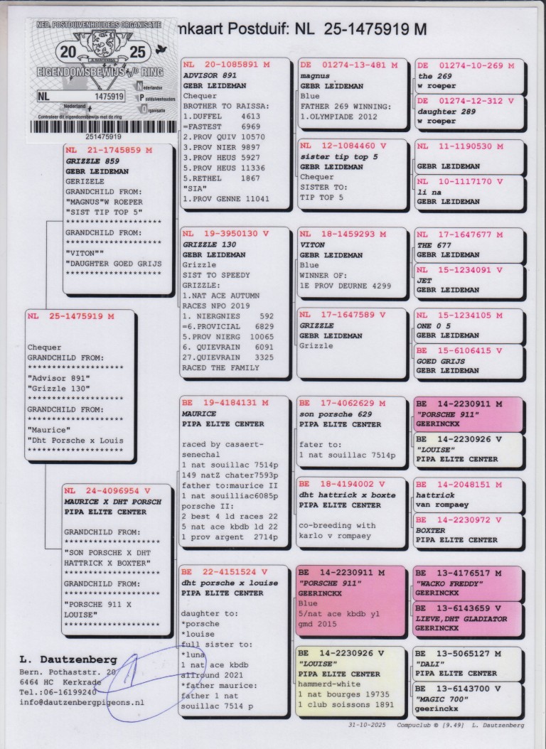 Uit: ”Grizzle 859”, uit zus ”Speedy Grizzle”, 1. Nat. Asduif Natour WHZB x ”Maurice x Dtr. Porsche”, dochter ”Maurice”, 1. Nat. 7.514 d., vader 1. Nat. 6.085 d., uit dochter ”Porsche 911”, 5. Nat. Asduif GHF KBDB