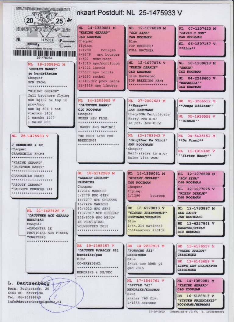 Uit: ”Gerard Harry”, zoon ”Kleine Gerard”, Superkweker J. & F. Hendriks x ”Daughter Ace Gerard”, dochter ”Asduif Gerard”, 1. Prov. Asduif Jonge Duiven, 1.-2.314 d., 3. NPO 2.778 d., uit dochter ”Porsche 911”, 5. Nat. Asduif KBDB
