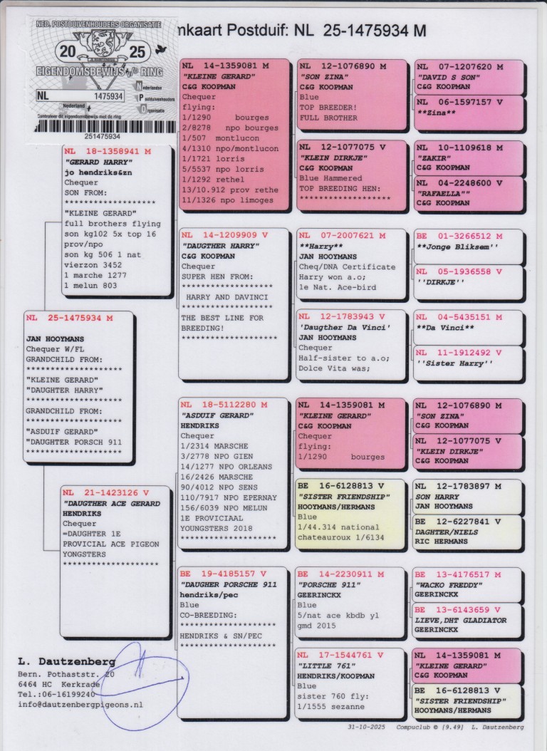 Uit: ”Gerard Harry”, zoon ”Kleine Gerard”, Superkweker J. & F. Hendriks x ”Daughter Ace Gerard”, dochter ”Asduif Gerard”, 1. Prov. Asduif Jonge Duiven, 1.-2.314 d., 3. NPO 2.778 d., uit dochter ”Porsche 911”, 5. Nat. Asduif KBDB