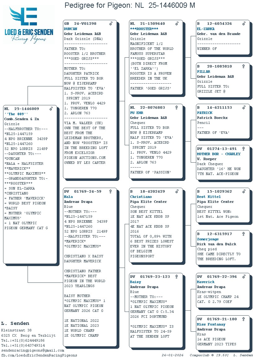 Uit: ”Duncan”, uit 1/2 broer ”Goed Grijs”, 7x 1. Prijs & 1. NPO Laon 6.371 d., nazaten winnen 7x 1. Nat. Asduif x ”Nala”, moeder 4. NPO Brienne 3.439 d., 1/2 zus ”Maverick”, 1. Int. Asduif Jaarlingen FCI, uit zoon ”Best Kittel”