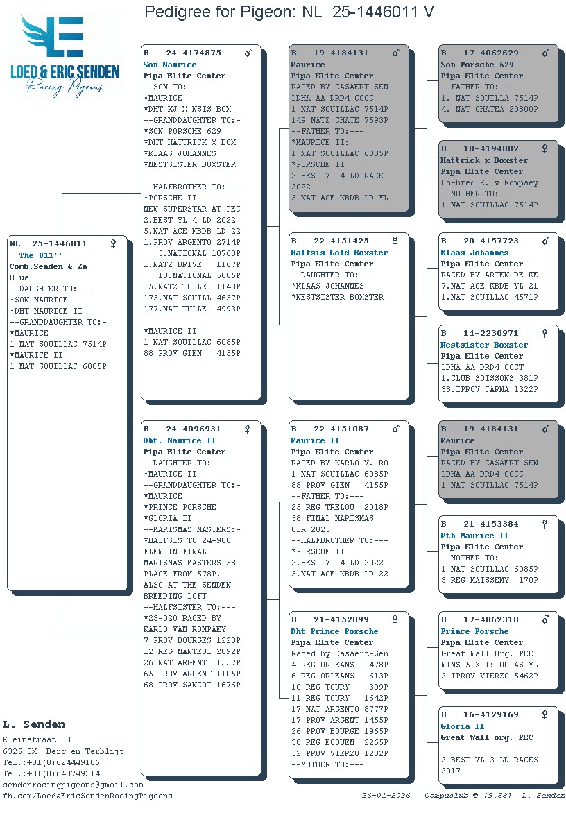 Uit: ”Son Maurice”, 1/2 broer ”Porsche II”, 2. Nat. Asduif Fond, zoon ”Maurice”, 1. Nat. Souillac 7.514 d. x ”Dght. Maurice II”, 58. Finale OLR Marismas Masters 578 d., dochter ”Maurice II”, 1. Nat. Souillac 6.085 d.