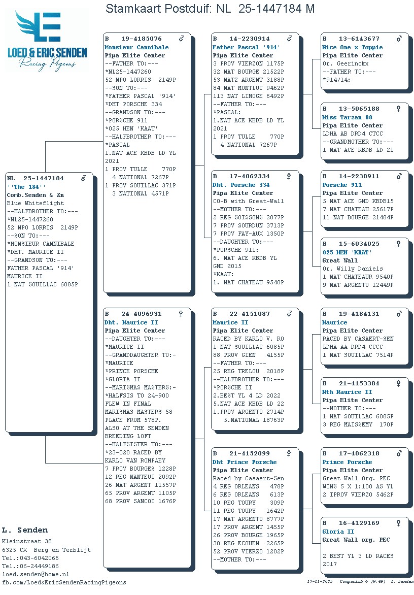 Uit: ”Monsieur Cannibale”, 1/2 broer ”Pascal”, 1. Nat. Asduif Fond KBDB, uit dochter ”Porsche 911”, Stamduif PIPA Elite Center x ”Dgt. Maurice II”, dochter ”Maurice II”, 1. Nat. Souillac 6.085 d., uit dochter ”Prince Porsche”