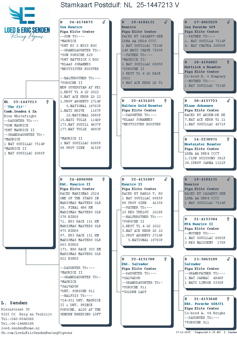 Uit: ”Son Maurice”, 1/2 broer ”Porsche II”, 2. Nat. Asduif Fond, zoon ”Maurice”, 1. Nat. Souillac 7.514 d. x ”Dght. Maurice II”, 58. Finale OLR Marismas Masters 578 d., dochter ”Maurice II”, 1. Nat. Souillac 6.085 d.