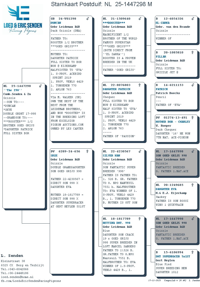 Uit: ”Duncan”, uit 1/2 broer ”Goed Grijs”, 7x 1. Prijs & 1. NPO Laon 6.371 d., nazaten winnen 7x 1. Nat. Asduif x ”Skye”, uit zoon & dochter ”Son Goed Grijs 998”, gr-vader ”Nieuw Goed Grijs”, 1. Nat. Asduif Midfond NPO