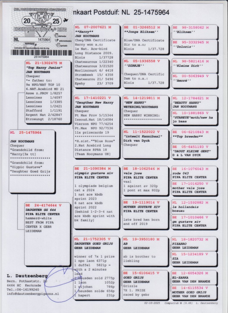 Uit: “Top Harry Junior”, vader 9x top 10 NPO, 1.-8.257d., 1.-4.097d., uit “Harry” & dochter “New Harry” x “The 644”, dochter “Olympic Gustave”, 1. Olympiade Duif & dochter “Goed Grijs”.